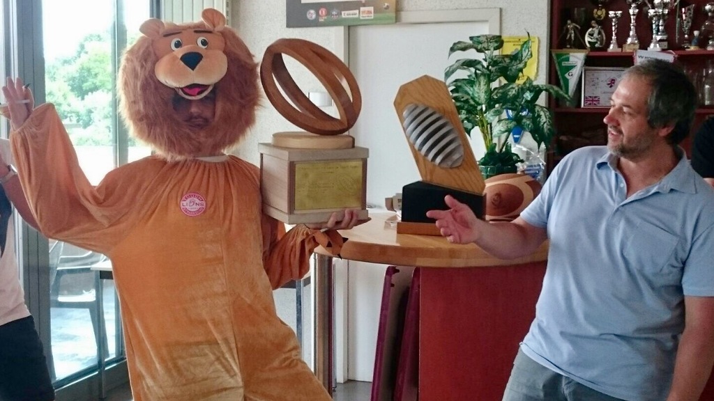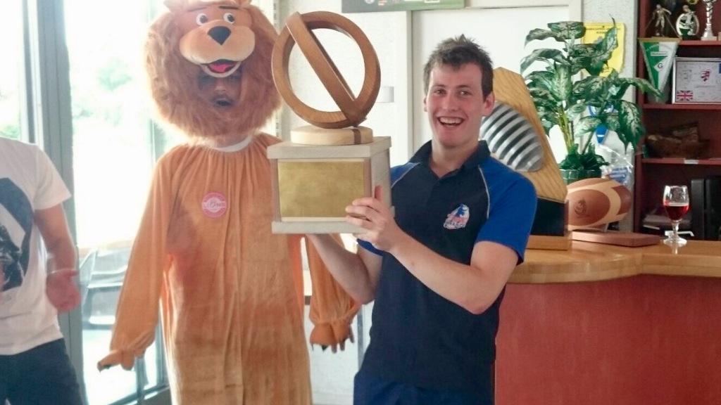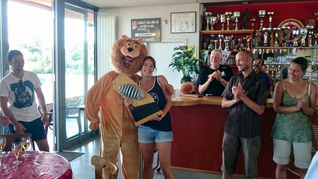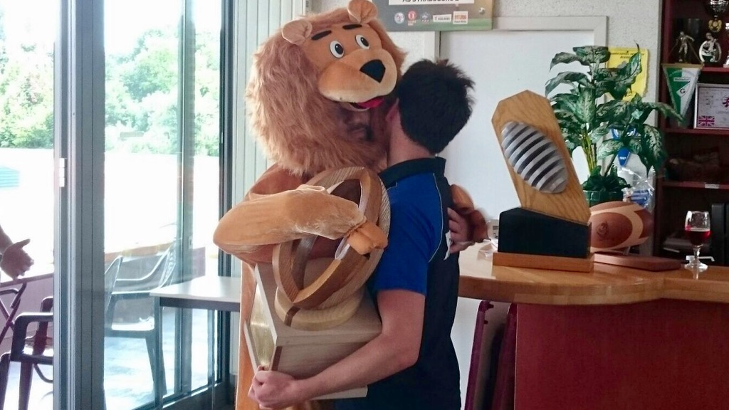 Anaïs et Quentin ont eu le plaisir de se voir remettre des mains de la mascotte des Lions de Touch Strasbourg les 2 trophées !